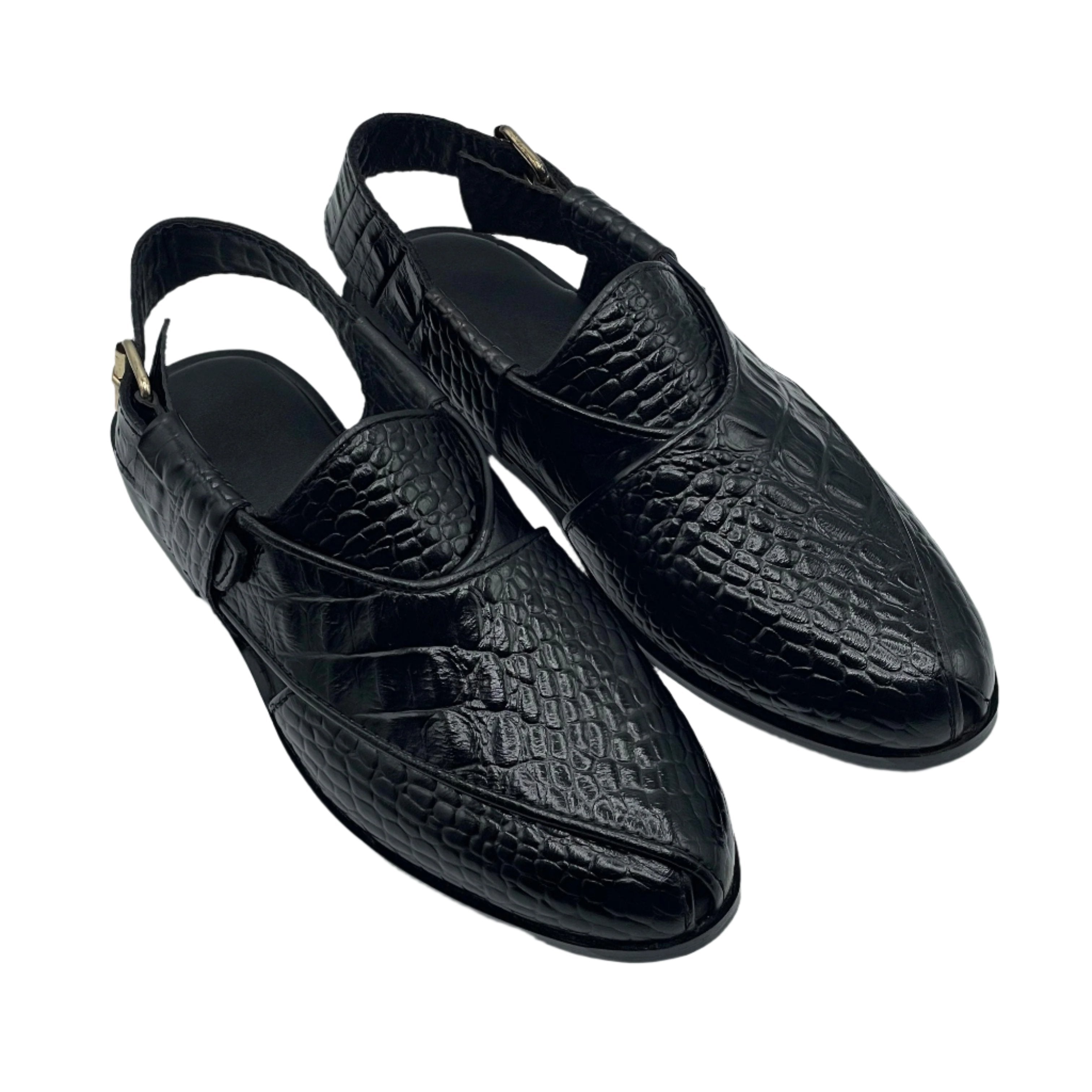 Looking for a stylish twist on a classic? Check out our black croc Peshawari chappals, now available . These sandals feature a cool crocodile-inspired texture on sleek black material, giving a modern edge to the traditional Peshawari design. With an adjustable back strap for a perfect fit and a comfortable feel, they're great for everyday wear or adding a unique touch to your outfits around Lahore. Step out in comfort and contemporary style with these eye-catching chappals!