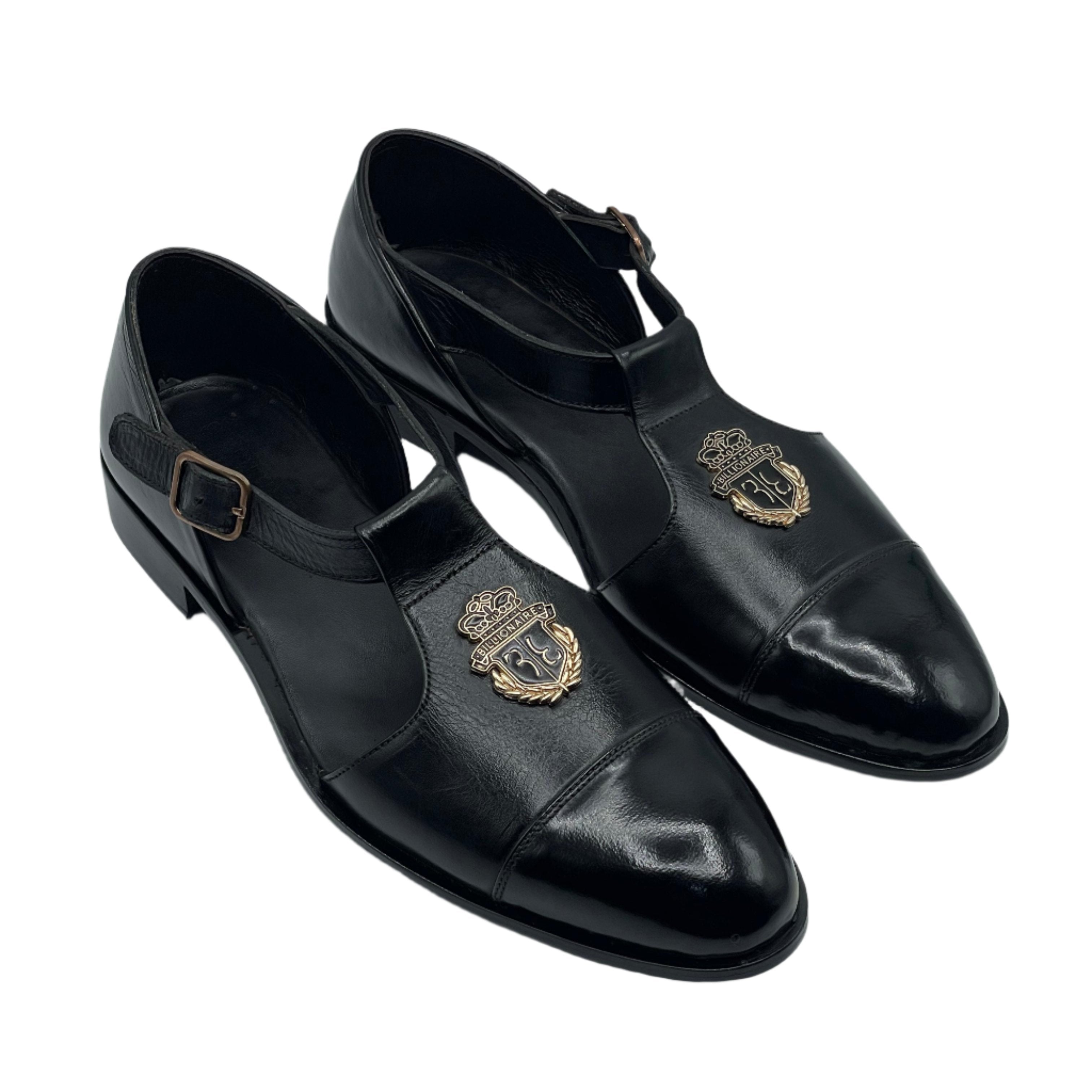 Make a statement with our unique black emblem T-strap sandals, now available. Featuring a sleek black design with a distinctive metallic emblem on the T-strap, these sandals offer a modern and stylish look. The adjustable buckle strap ensures a secure and comfortable fit, making them ideal for everyday wear around. Step out in comfort and individuality with these eye-catching sandals!