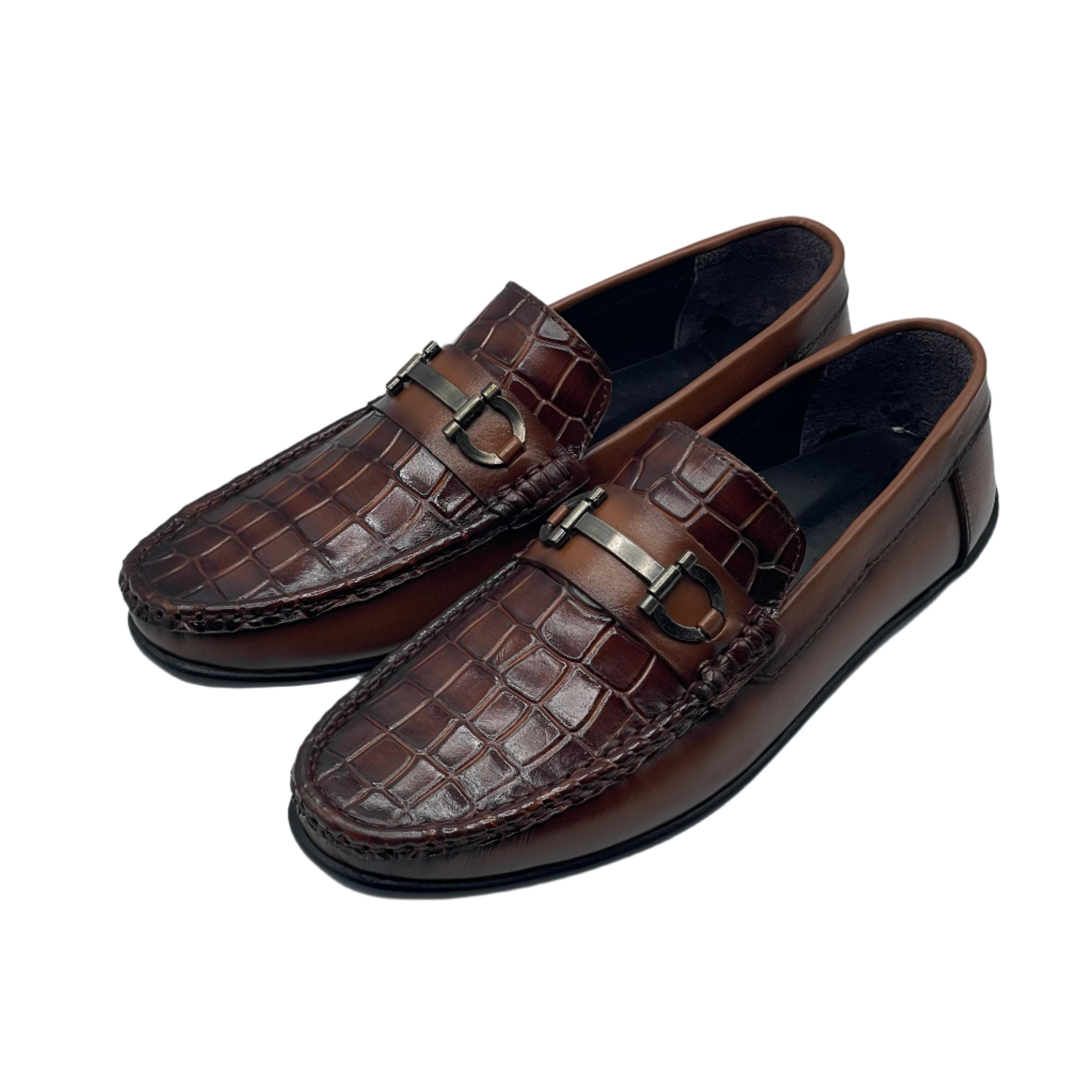 Elevate your formal attire with our brown crocodile leather loafers, now available. Featuring a rich brown leather embossed with a stylish crocodile pattern and a refined metallic buckle detail, these loafers exude sophisticated elegance. Crafted for both style and comfortable wear, they are the perfect choice for business meetings or special occasions. Step into refined style with these distinguished loafers.
