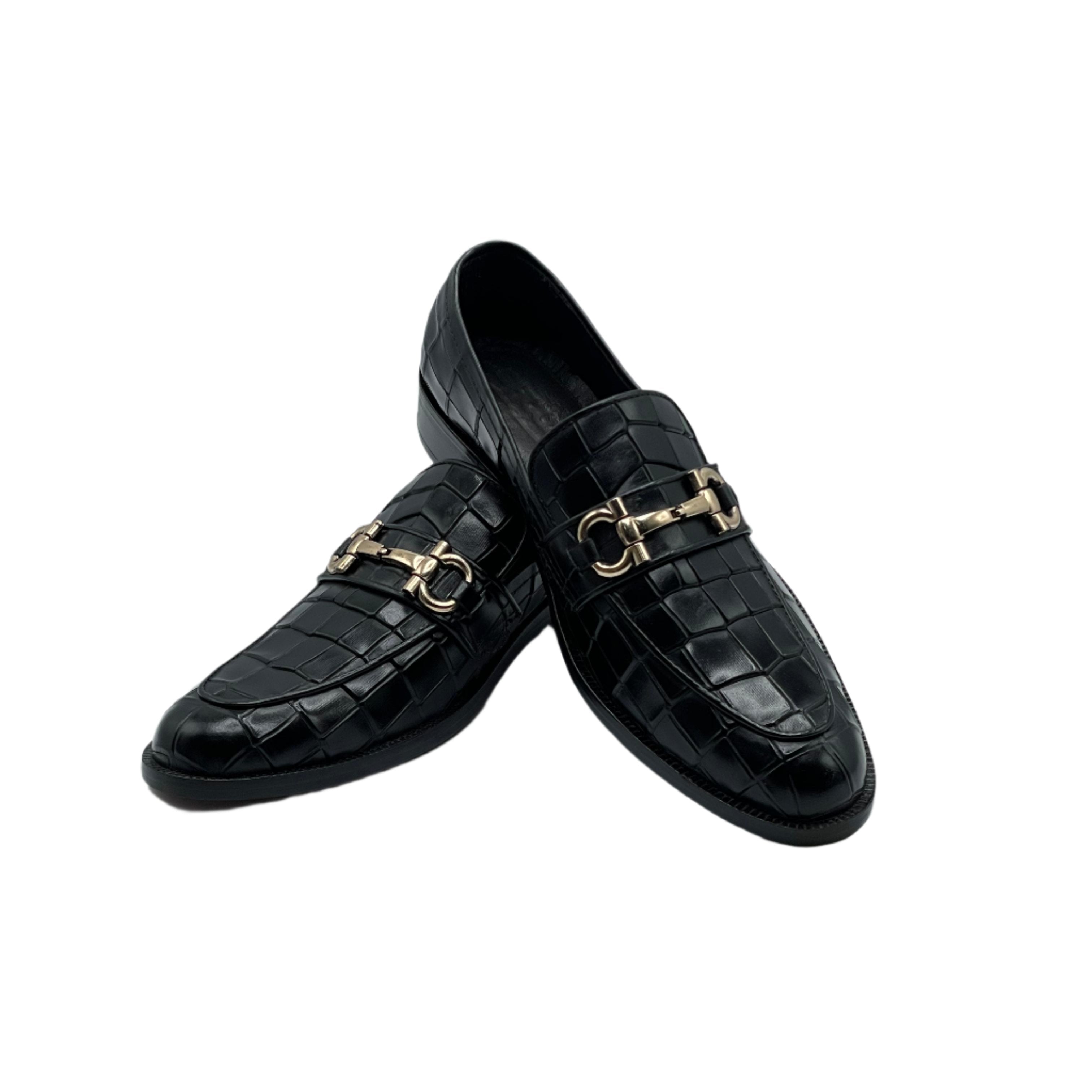 Elevate your presence with our Noirtide bespoke black crocodile pattern leather loafers, exclusively These statement slip-on shoes feature a striking crocodile-embossed design and a polished gold-tone horsebit detail, embodying sophisticated luxury. Meticulously handcrafted, they offer exceptional comfort and enduring quality. Make a lasting impression with these unique and artisanal leather loafers, a testament to refined taste. Discover the pinnacle of bespoke footwear