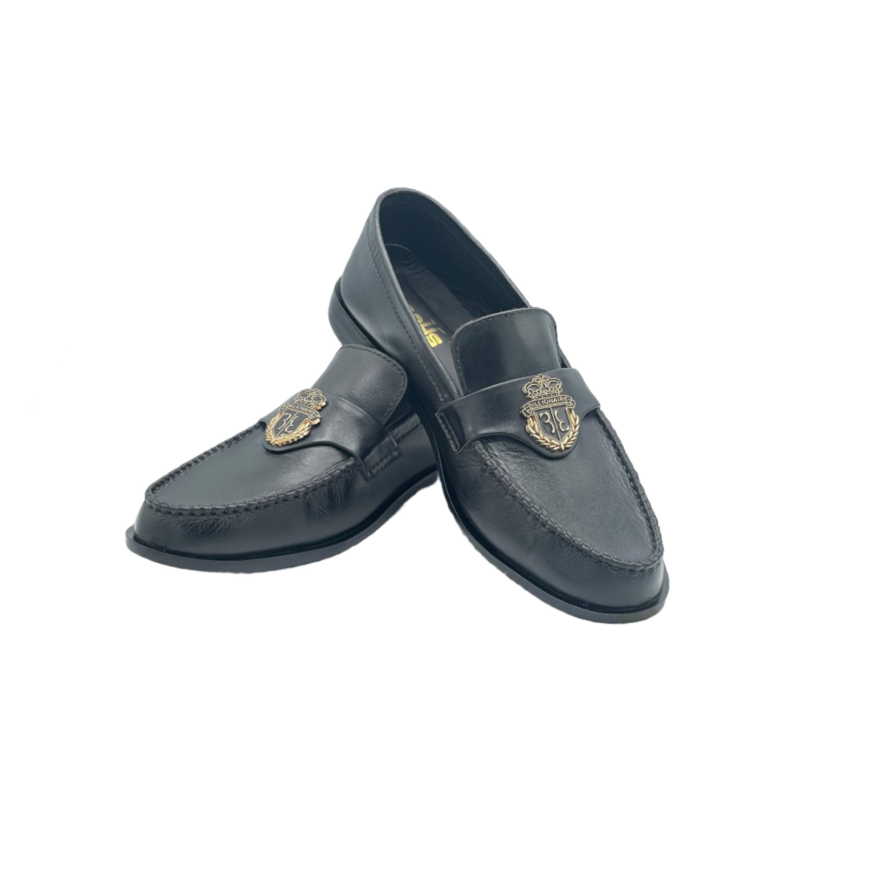 Make a statement of sophisticated style with our black crest loafers, now available. These elegant slip-on shoes feature a distinctive metallic crest detail, adding a touch of regal charm to your look. Crafted from smooth black leather, they offer both style and comfortable wear for any occasion. Elevate your footwear collection with these distinguished loafers, a symbol of refined taste.
