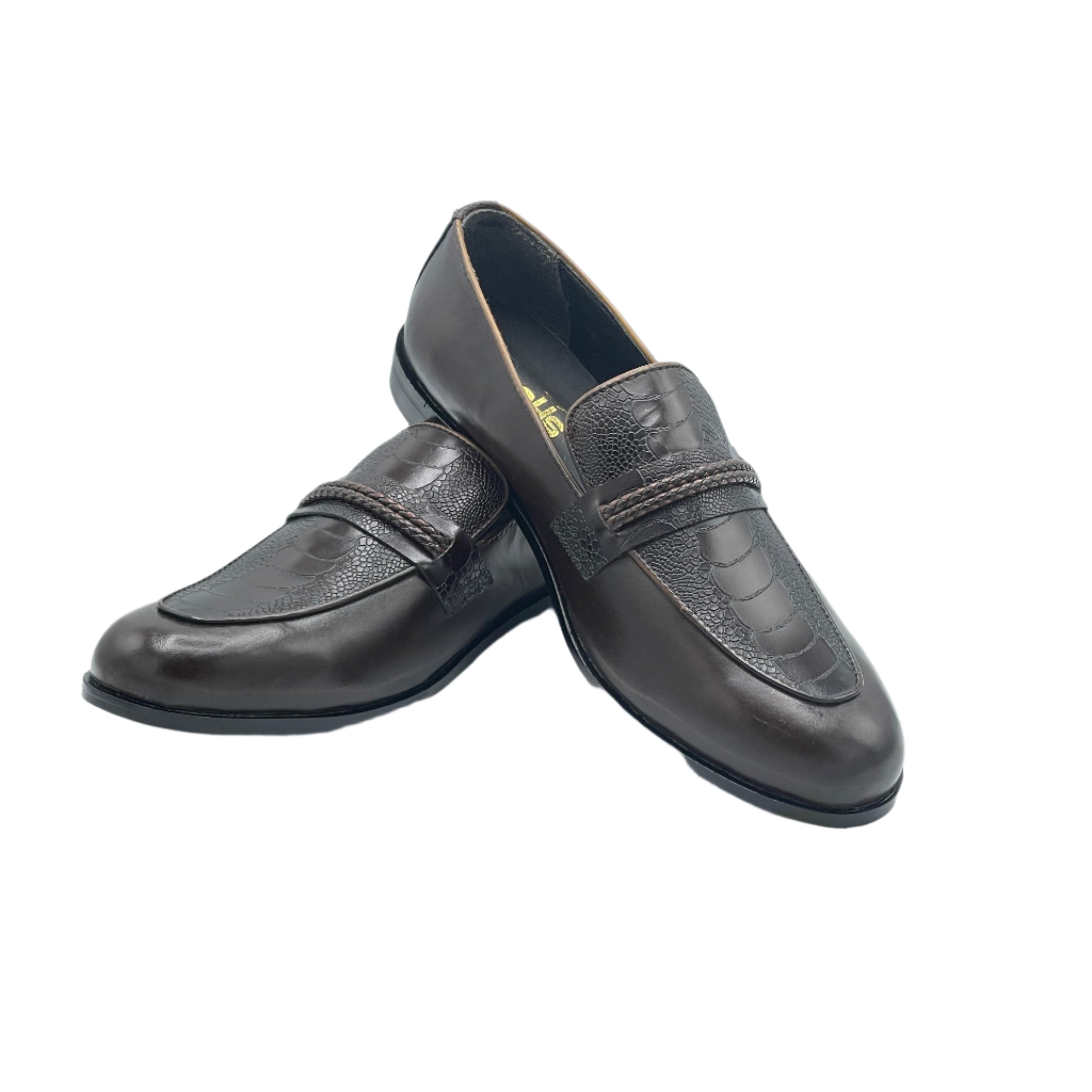 Add a touch of distinctive style to your footwear with our textured brown leather loafers, now available. These slip-on shoes feature a unique textured panel across the vamp, adding visual interest to the rich brown leather. Designed for both style and everyday comfort , they offer a smooth interior and a supportive insole. Perfect for adding a touch of personality to your smart-casual or business-casual outfits. Discover these stylish and comfortable men's loafers today.