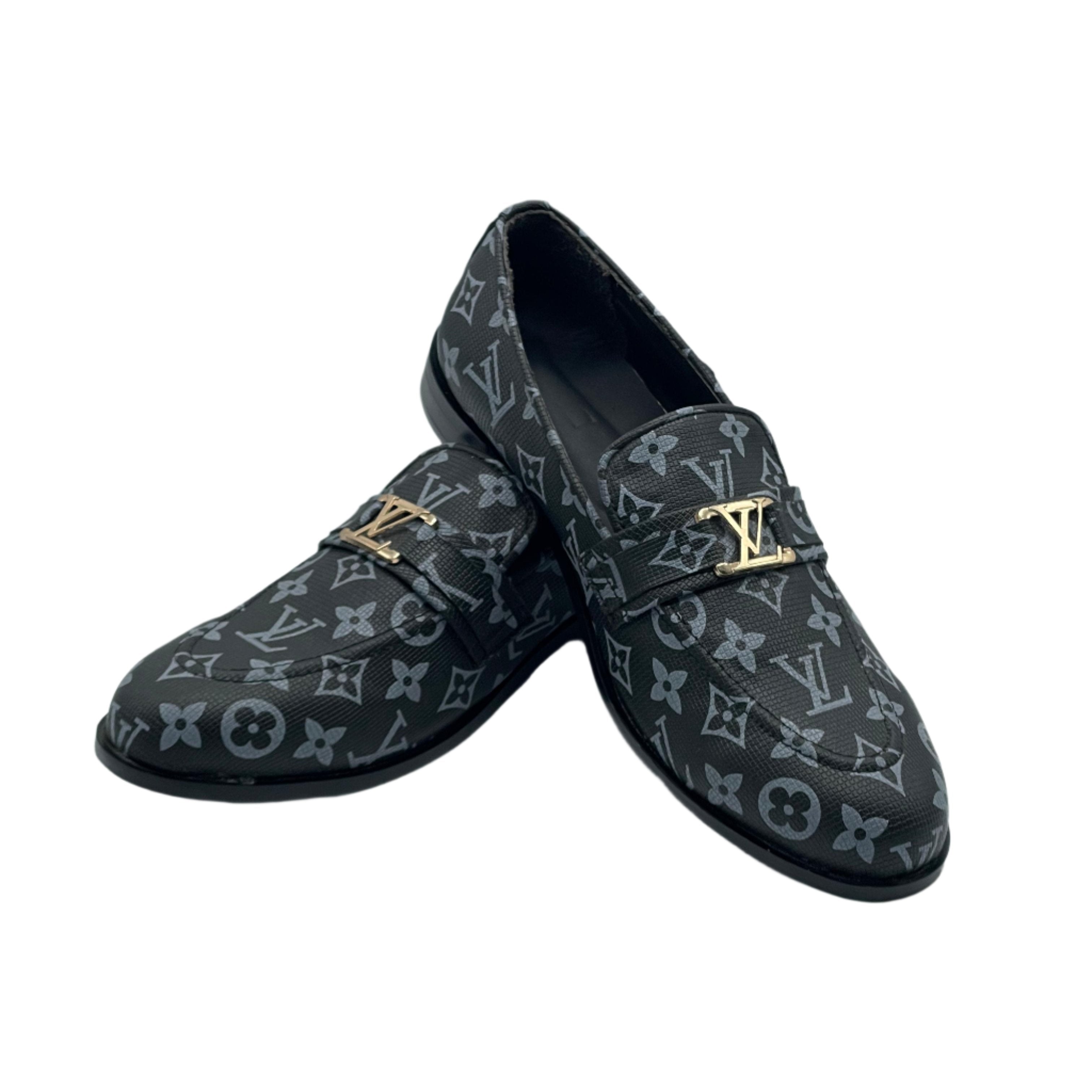 Elevate your style with these iconic Louis Vuitton pattern loafers, now available. Featuring the recognizable LV monogram in a sophisticated black and grey, these designer slip-on shoes exude luxury and high fashion. Crafted for both visual appeal and comfort, they offer a smooth interior and a stylish gold-tone LV buckle. Make a statement with these authentic Louis Vuitton loafers, perfect for adding a touch of designer flair to any occasion. Discover exclusive luxury footwear in Lahore.
